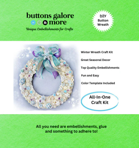 Create a frosty accent piece guests will rave about - perfect for mantel displays, entryways, or winter parties What is included: White, ivory & pale blue craft buttons Snowflake shaped craft buttons Coordinating baubles Polymer clay pieces Matching ribbon 8" Cardboard wreath Step by step instructions