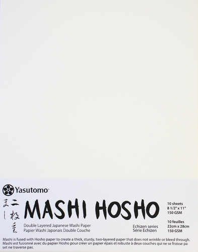 Mashi Hosho is made in Echizen, located within the Fukui prefecture in Japan. Smooth Mashi is fused with sturdy Hosho on the back side, producing a thick, sturdy paper that accepts mediums beautifully on both sides.